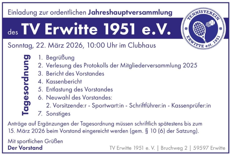 TV Erwitte Bruchweg 2, Erwitte, nrwAm 22. März 2026 findet die diesjährige ordentliche Mitgliederversammlung statt. 💪🏼 Hierzu sind alle Mitglieder herzlich eingeladen. Die Tagesordnung ist dem Beitrag zu entnehmen. Wir freuen uns auf zahlreiches erscheinen […]